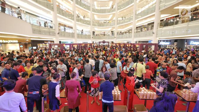 Suasana antrian pembagian kue bulan pada perayaan Festival Musim Gugur di Pluit Village, Jakarta, Sabtu (22/9). Festival Musim Gugur atau Festival Kue Bulan identik dengan pembagian kue bulan sebagai lambang kesejahteraan. (Liputan6.com/Herman Zakharia)