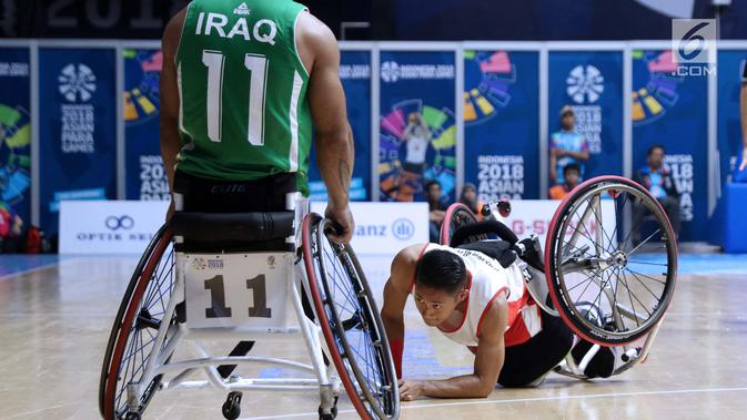 Pebasket Para Indonesia, Donald P Santoso berebut bola saat laga melawan Irak pada kompetisi basket Asian Para Games 2018 di Hall Basket, Kompleks GBK, Jakarta, Kamis (11/10). Indonesia kalah telak 27-97. (Liputan6.com/Helmi Fithriansyah)