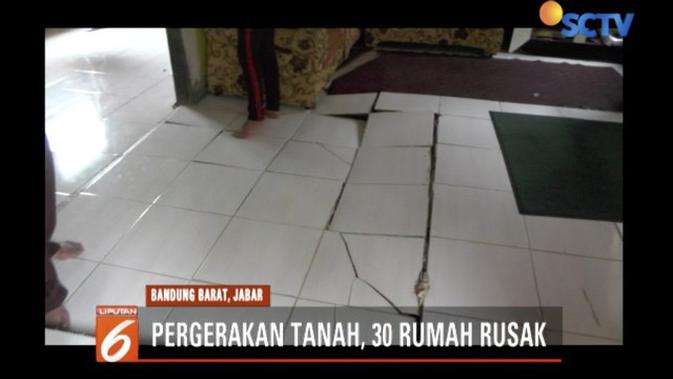 Liputan6.com, Bandung - Pergerakan tanah terjadi di Desa Puncaksari, Kecamatan Sindangkerta, Bandung Barat, Jawa Barat. Akibatnya 30 rumah warga rusak parah.