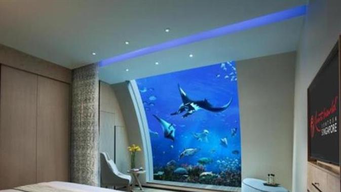 Apa kamu pecinta bawah laut atau ikan? Nampaknya kamu patut mencoba menginap di Equarius Hotel di Singapura ini. Hotel yang terdapat di kawasan Resorts World Sentosa ini akan menyediakan akuarium raksasa di dalam kamarnya. Dalam akuarium setinggi 36 meter dengan lebar 8,3 meter tersebut terdapat 50 ribu ikan dengan 70 spesies.