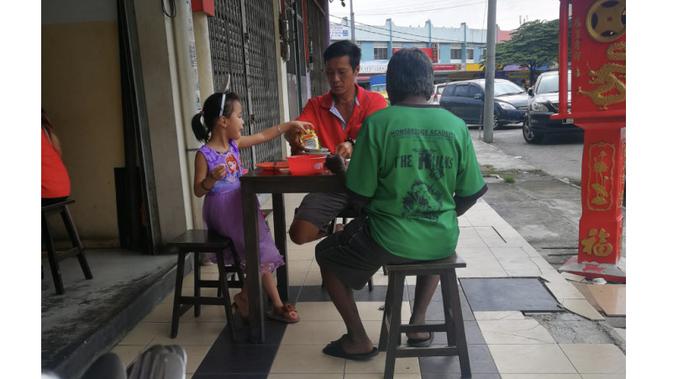 "Pria yang mengenakan kaus hijau adalah gelandangan. Dia berdiri di pintu masuk Bak Kut Teh ini dan menatap ke dalam warung sambil mengusap-usap perutnya."
