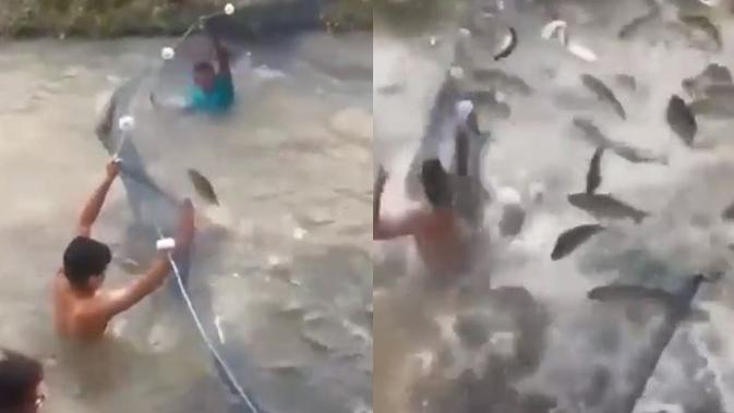 Namun lama-kelamaan, arus makin deras dan ikan malah melompat. Bahkan tak sedikit ikan-ikan tersebut melompat keluar dari jala.